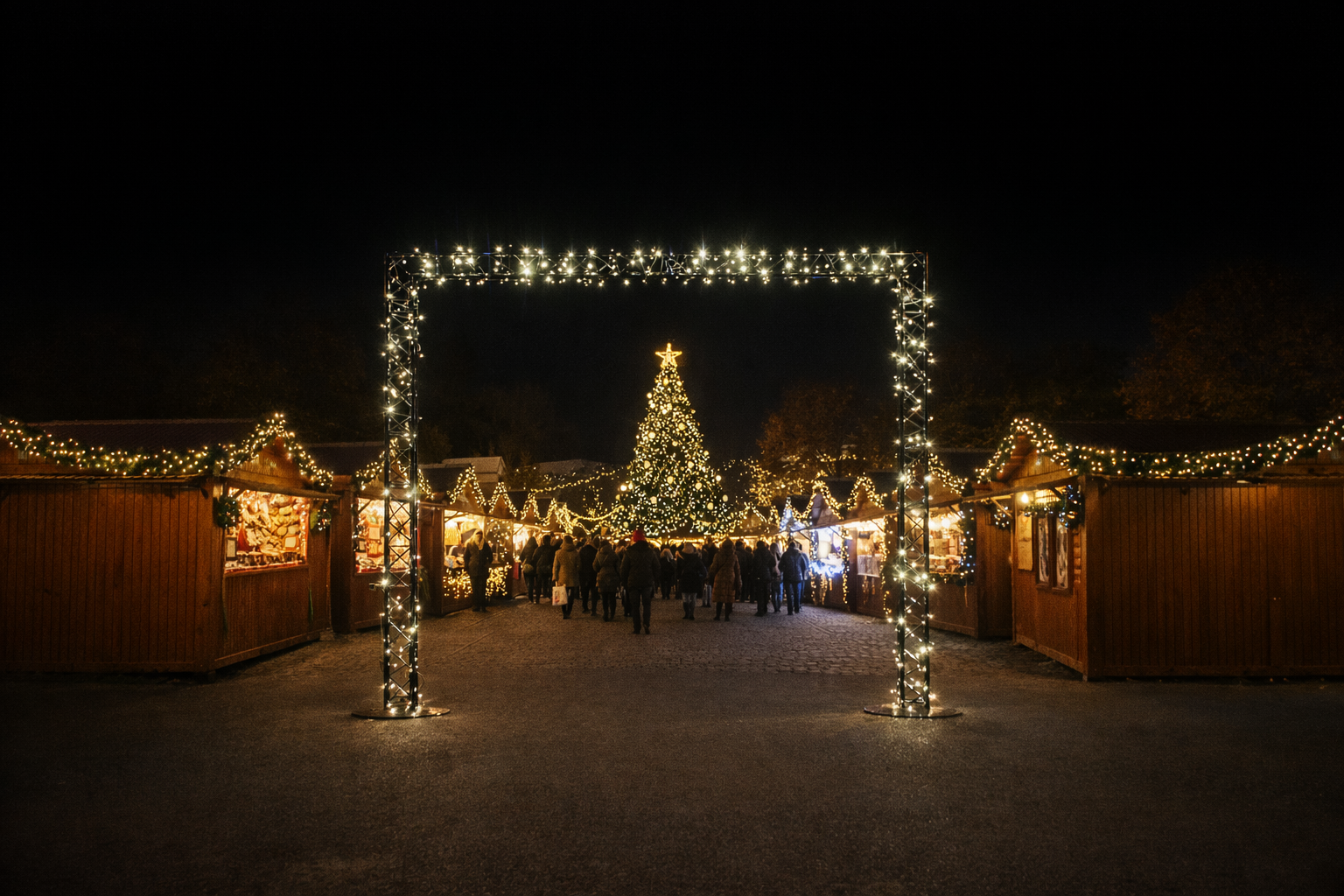 La période des fêtes est un moment unique, où chaque détail compte pour créer une ambiance chaleureuse et inoubliable. Pour sublimer l’entrée de votre marché de Noël, la location d’une arche en structure métallique noire avec guirlande fine est une solution à la fois élégante, moderne et festive. Véritable point d’accueil et élément visuel fort, cette arche transforme immédiatement votre événement en un lieu magique, propice à la convivialité et à la féerie hivernale.