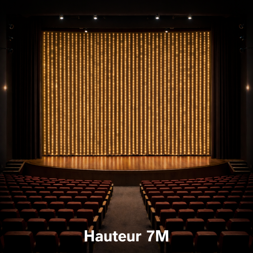 Chaque rideau mesure 1 mètre de largeur, avec une hauteur entièrement personnalisable selon vos besoins. Ils sont également connectables entre eux, ce qui permet de couvrir de grandes surfaces et de créer un véritable mur lumineux, quelle que soit la taille de votre scène.