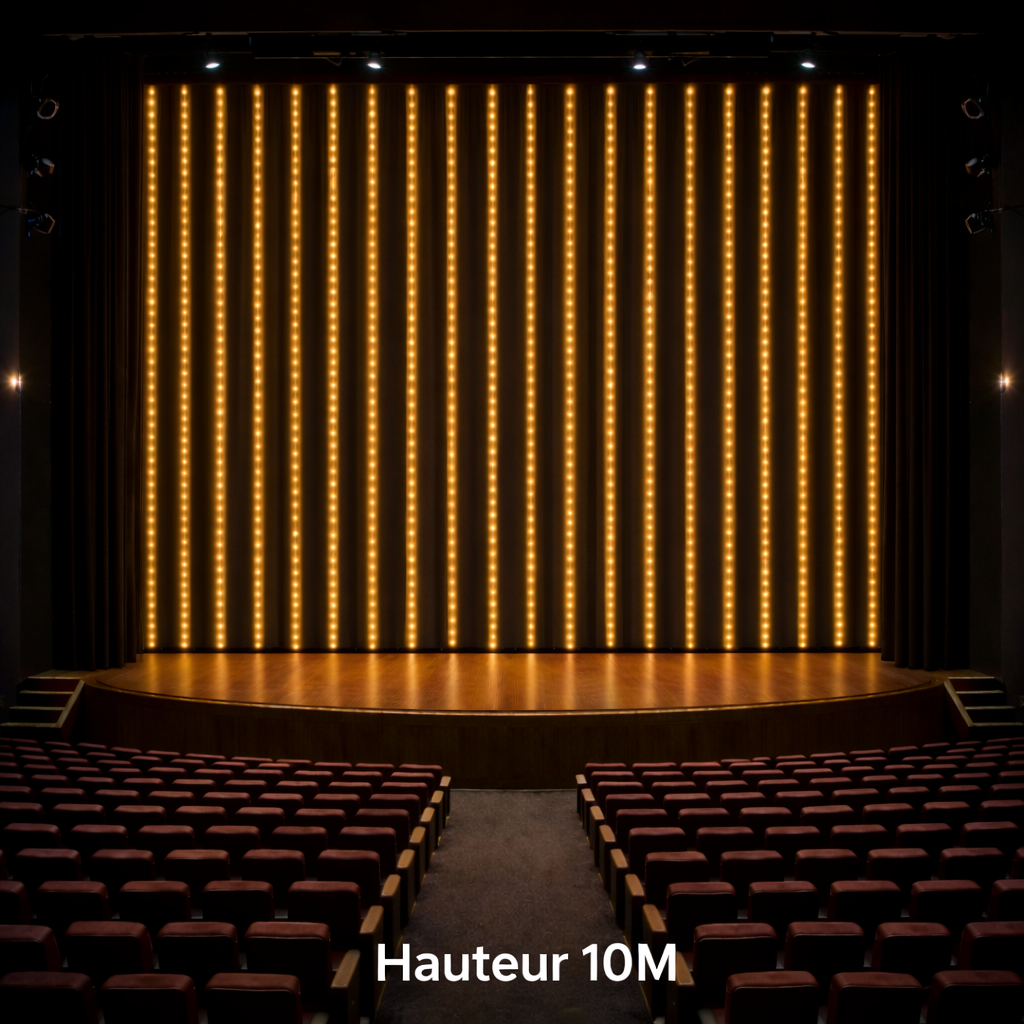 Chaque rideau mesure 1 mètre de largeur, avec une hauteur entièrement personnalisable selon vos besoins. Ils sont également connectables entre eux, ce qui permet de couvrir de grandes surfaces et de créer un véritable mur lumineux, quelle que soit la taille de votre scène.