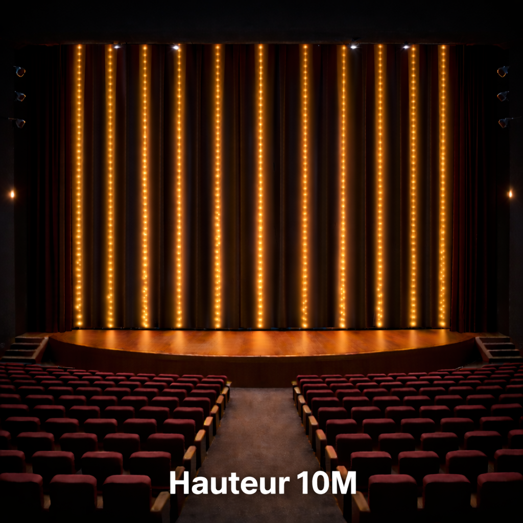 Chaque rideau mesure 1 mètre de largeur, avec une hauteur entièrement personnalisable selon vos besoins. Ils sont également connectables entre eux, ce qui permet de couvrir de grandes surfaces et de créer un véritable mur lumineux, quelle que soit la taille de votre scène.