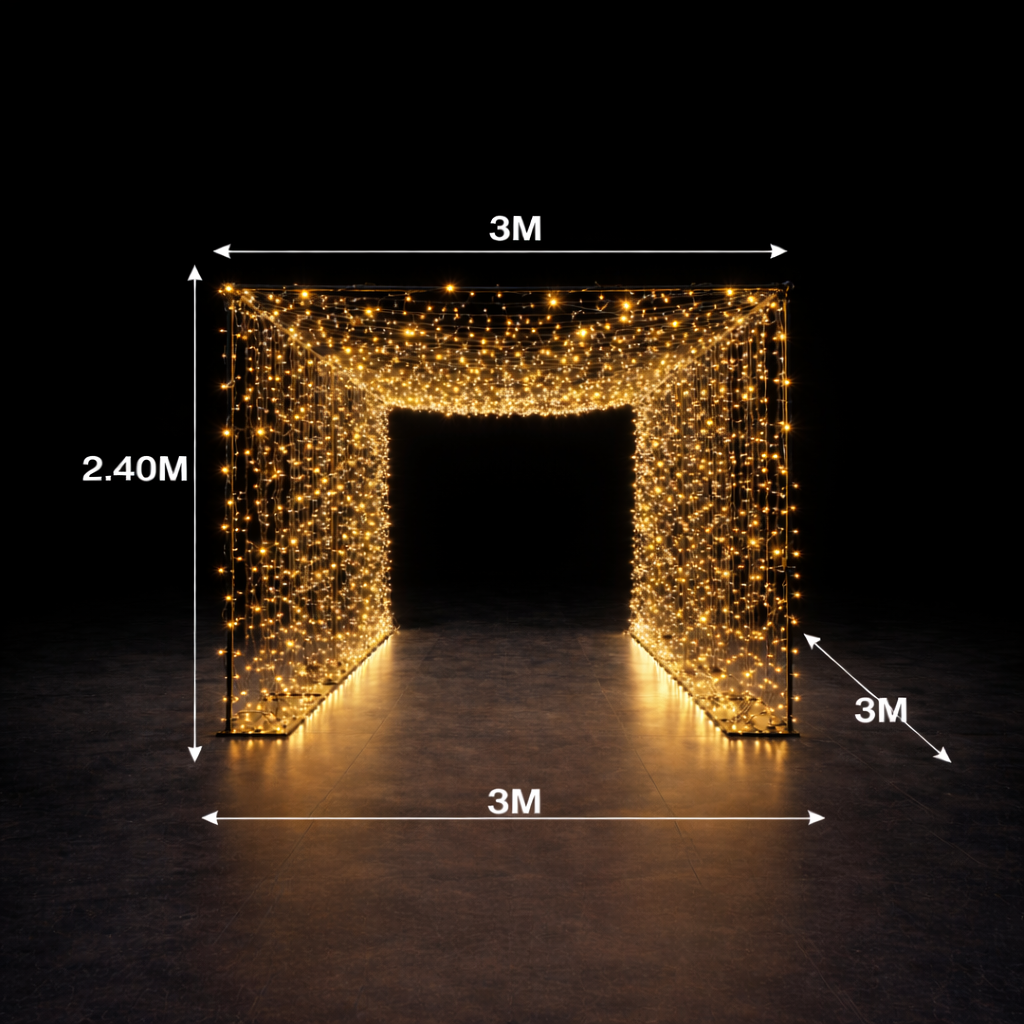 Chaque guirlande mesure 10 mètres et présente l’avantage majeur d’être raccordable. Cela permet d’adapter la structure à quasiment toutes les configurations de lieux. Les dimensions fixes assurent une stabilité optimale : 2,40 m de hauteur et 3 m de largeur, une largeur idéale pour installer un banquet en dessous. Les invités peuvent circuler aisément autour des tables tout en profitant pleinement de l’ambiance lumineuse, sans sensation d’encombrement.