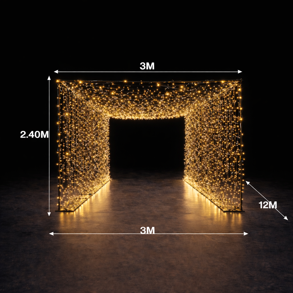 Chaque guirlande mesure 10 mètres et présente l’avantage majeur d’être raccordable. Cela permet d’adapter la structure à quasiment toutes les configurations de lieux. Les dimensions fixes assurent une stabilité optimale : 2,40 m de hauteur et 3 m de largeur, une largeur idéale pour installer un banquet en dessous. Les invités peuvent circuler aisément autour des tables tout en profitant pleinement de l’ambiance lumineuse, sans sensation d’encombrement.