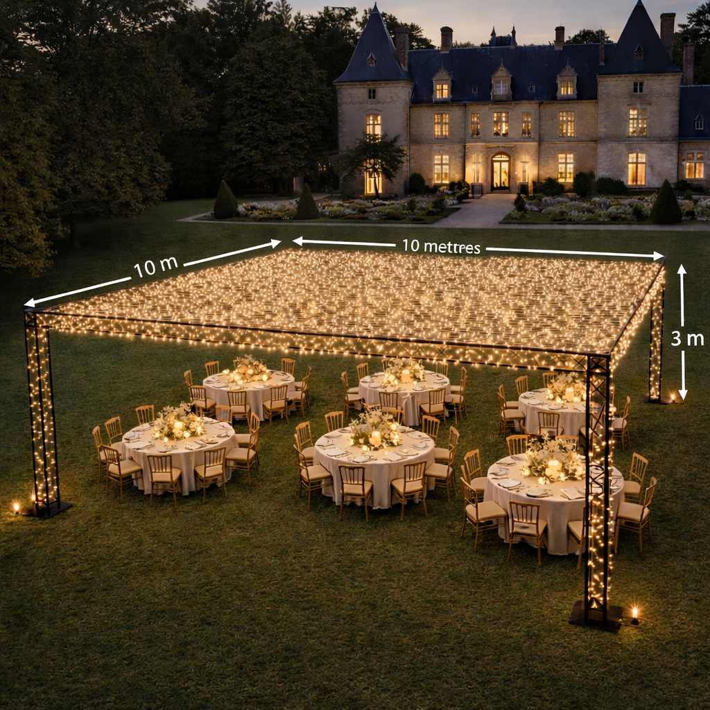 Au total, ce dispositif impressionnant comprend 1000 mètres de guirlandes, soit 10 000 LEDs. Ce volume lumineux permet de couvrir de grandes surfaces et de créer une véritable voûte céleste, idéale pour sublimer une piste de danse, une salle de réception, un chapiteau ou un espace extérieur. L’effet visuel est saisissant, aussi bien de jour que de nuit, et apporte une véritable dimension émotionnelle à votre événement.