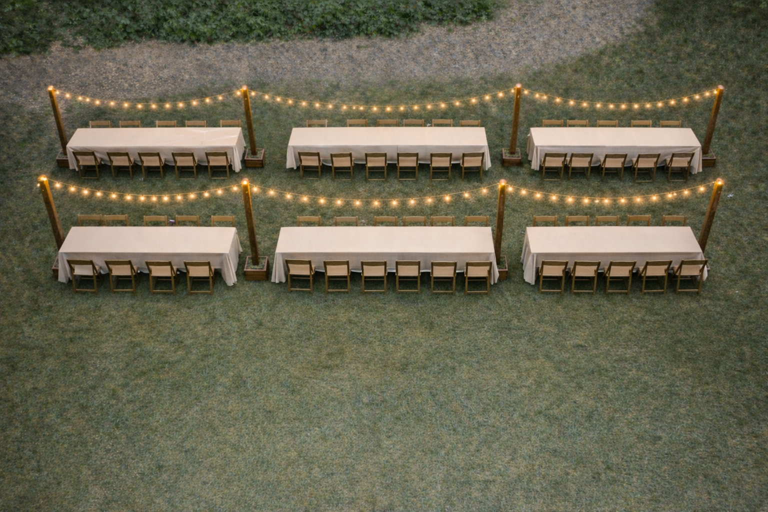 Contrairement à une installation purement décorative, ce kit est pensé comme une guirlande de visibilité. Les guirlandes équipées d’abats-jours en osier beige survolent uniquement les tables, et non l’ensemble de la zone de réception. Ce positionnement ciblé est essentiel : il concentre la lumière là où elle est nécessaire, c’est-à-dire sur les assiettes et les convives.