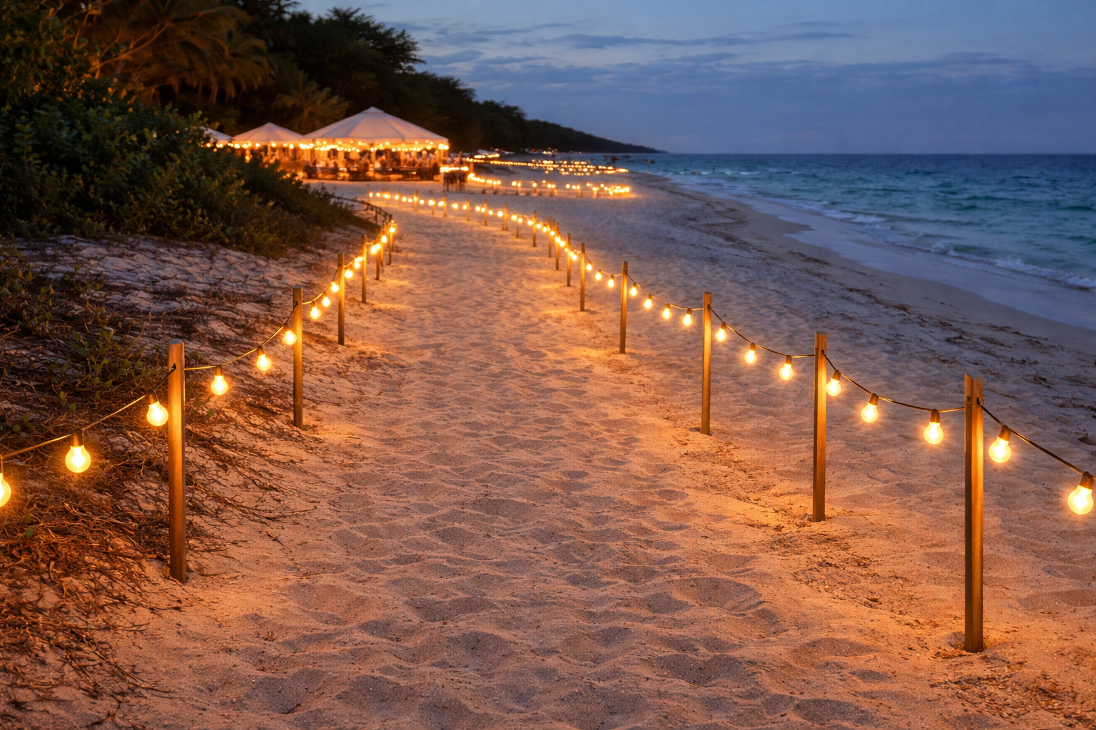 Mise en lumière d'un Mariage en Charente-Maritime avec guirlandes guinguettes blanc chaud