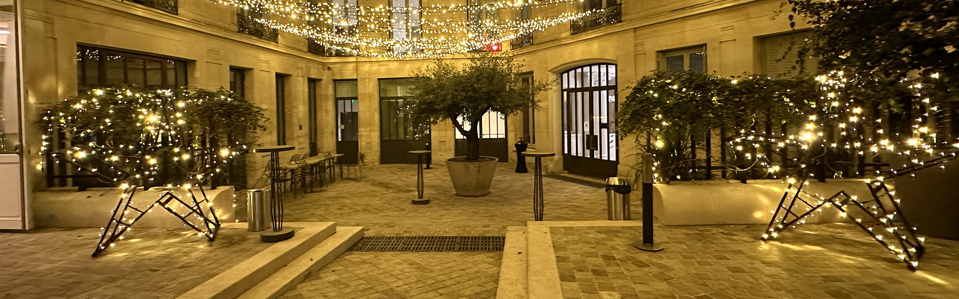 Derrière une façade haussmannienne discrète, cette cour pavée se dévoile comme un havre de paix, bordée de grands arbres centenaires. L’intervention de Comptoir de la Guirlande a magnifié chaque élément du décor : les guirlandes fines ont été installées avec subtilité pour souligner les contours des arbres, mettre en relief les façades et offrir une ambiance chaleureuse et raffinée.