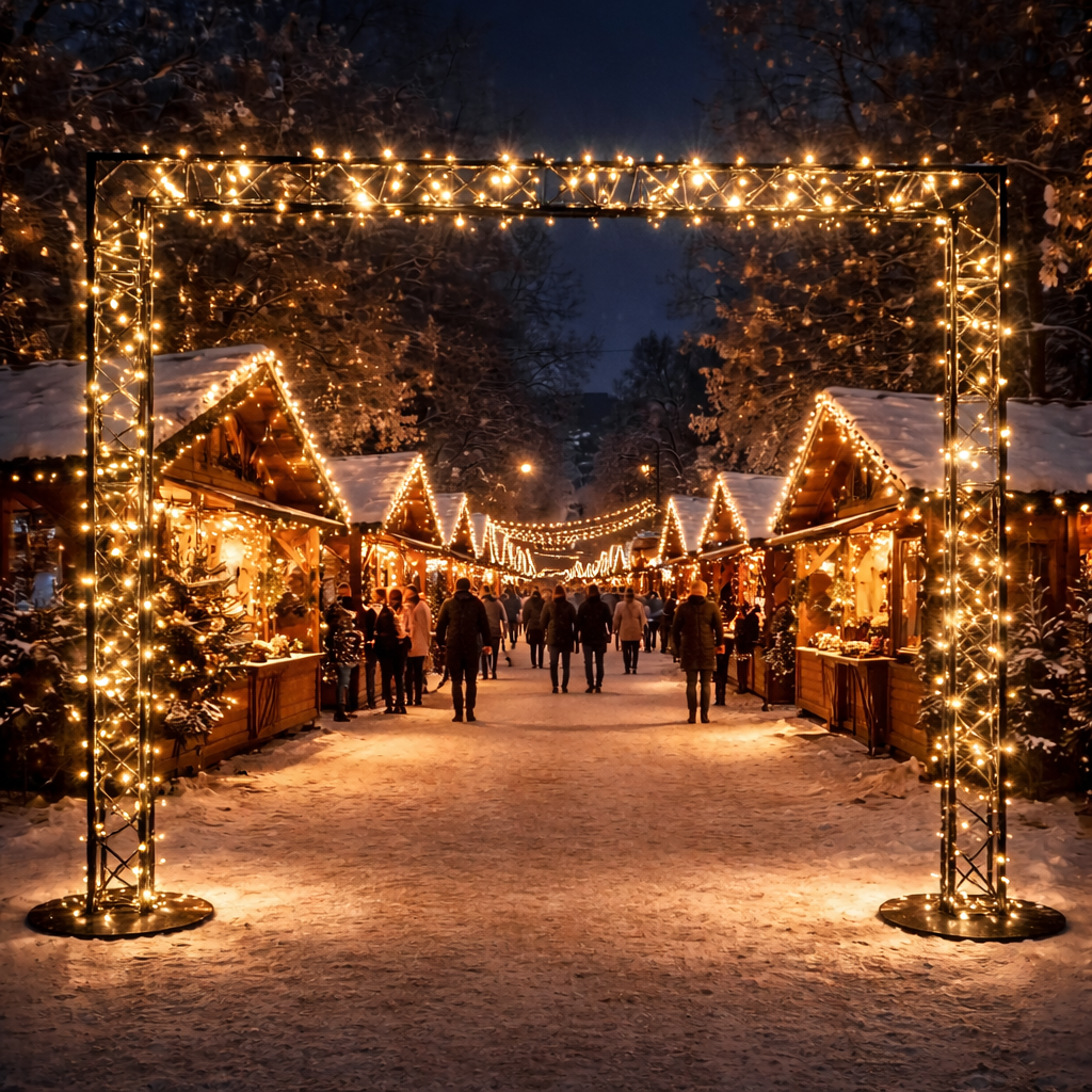 La période des fêtes est un moment unique, où chaque détail compte pour créer une ambiance chaleureuse et inoubliable. Pour sublimer l’entrée de votre marché de Noël, la location d’une arche en structure métallique noire avec guirlande fine est une solution à la fois élégante, moderne et festive. Véritable point d’accueil et élément visuel fort, cette arche transforme immédiatement votre événement en un lieu magique, propice à la convivialité et à la féerie hivernale.