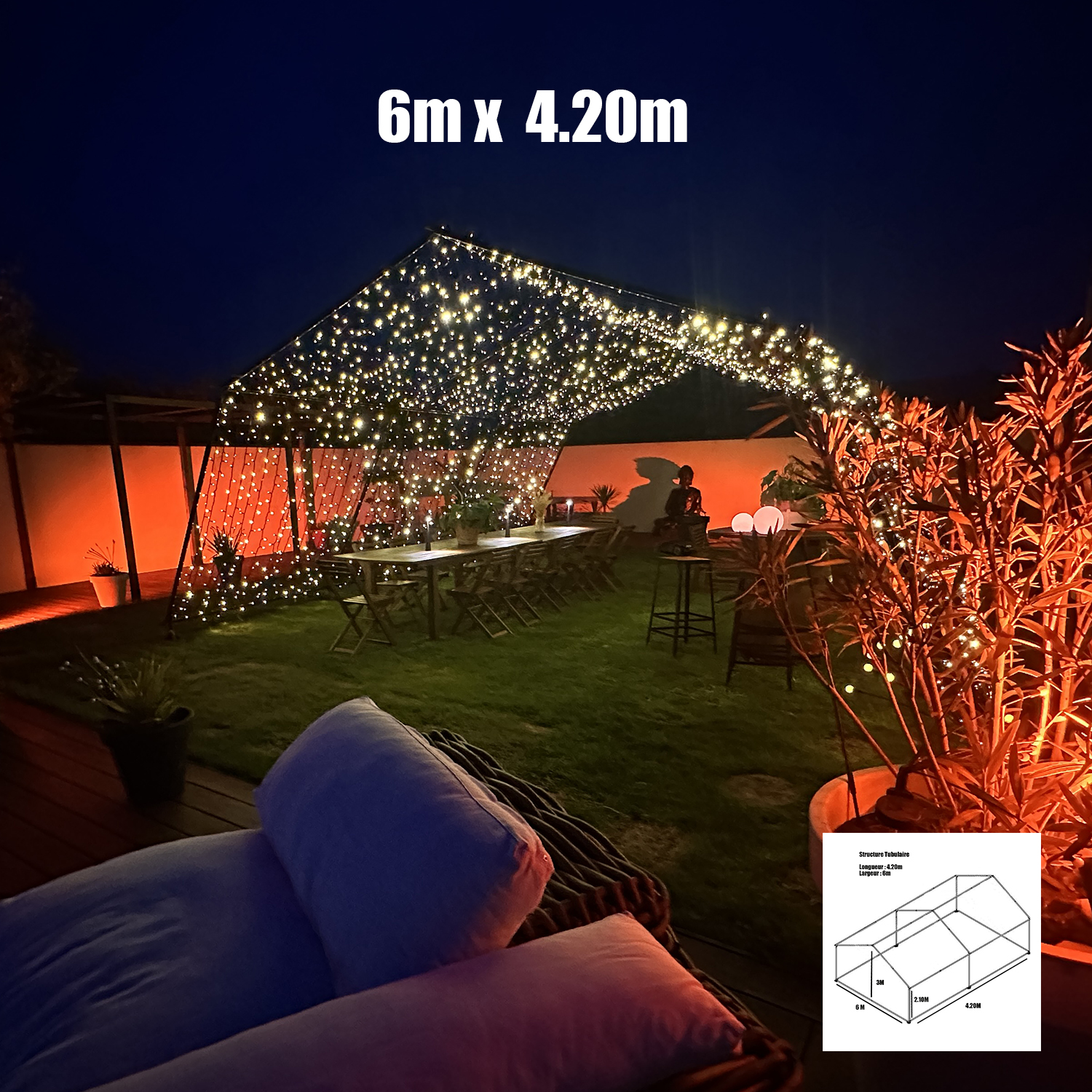 Le cœur du kit repose sur une structure tubulaire noire élégante, mesurant 6 mètres de large sur 4.2 mètres de long. Cette armature solide en aluminium, composée de tubes noirs et de connecteurs robustes, permet de créer un véritable ciel étoilé au-dessus de vos invités. Que ce soit pour un dîner champêtre, une cérémonie romantique ou une soirée dansante, cette installation apporte une touche de magie instantanée.