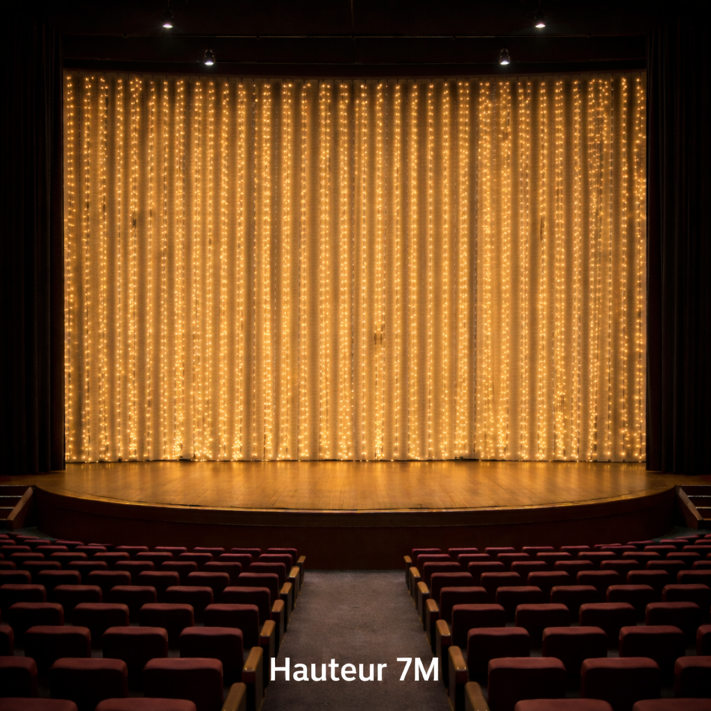 Il s’agit de rideaux composés de guirlandes LED fines, avec un espacement standard de 10 cm entre chaque LED. Ce maillage serré permet d’obtenir un fond lumineux homogène, idéal derrière un groupe de musique, des danseurs ou une scène de discours. La lumière blanc chaud diffuse une atmosphère chaleureuse et qualitative, parfaite pour mettre en valeur les artistes sans les éblouir.