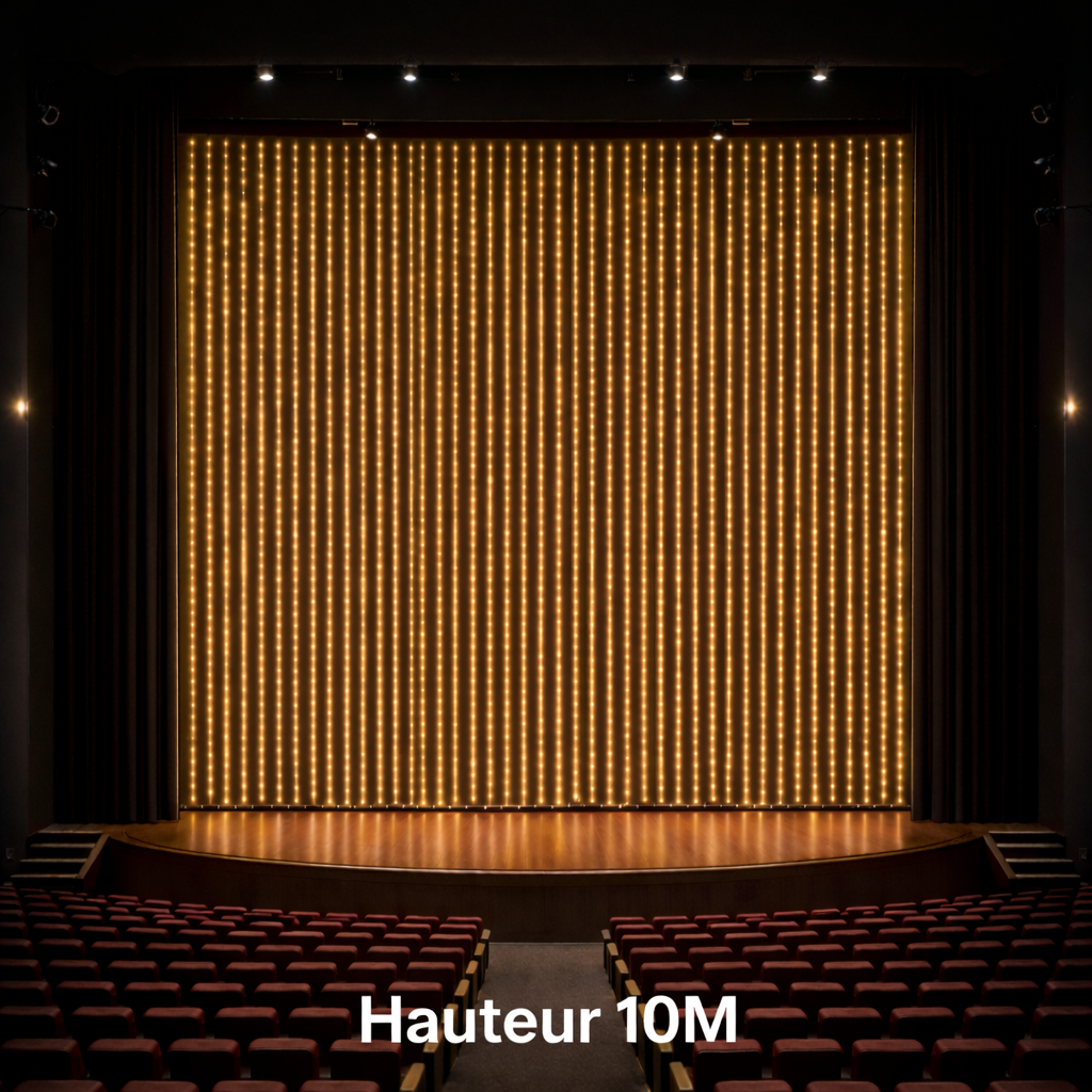 Chaque rideau mesure 1 mètre de largeur, avec une hauteur entièrement personnalisable selon vos besoins. Ils sont également connectables entre eux, ce qui permet de couvrir de grandes surfaces et de créer un véritable mur lumineux, quelle que soit la taille de votre scène.