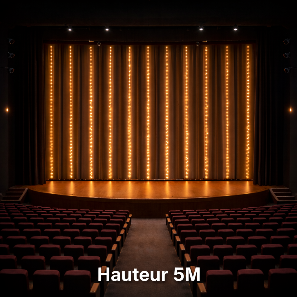 Chaque rideau mesure 1 mètre de largeur, avec une hauteur entièrement personnalisable selon vos besoins. Ils sont également connectables entre eux, ce qui permet de couvrir de grandes surfaces et de créer un véritable mur lumineux, quelle que soit la taille de votre scène.