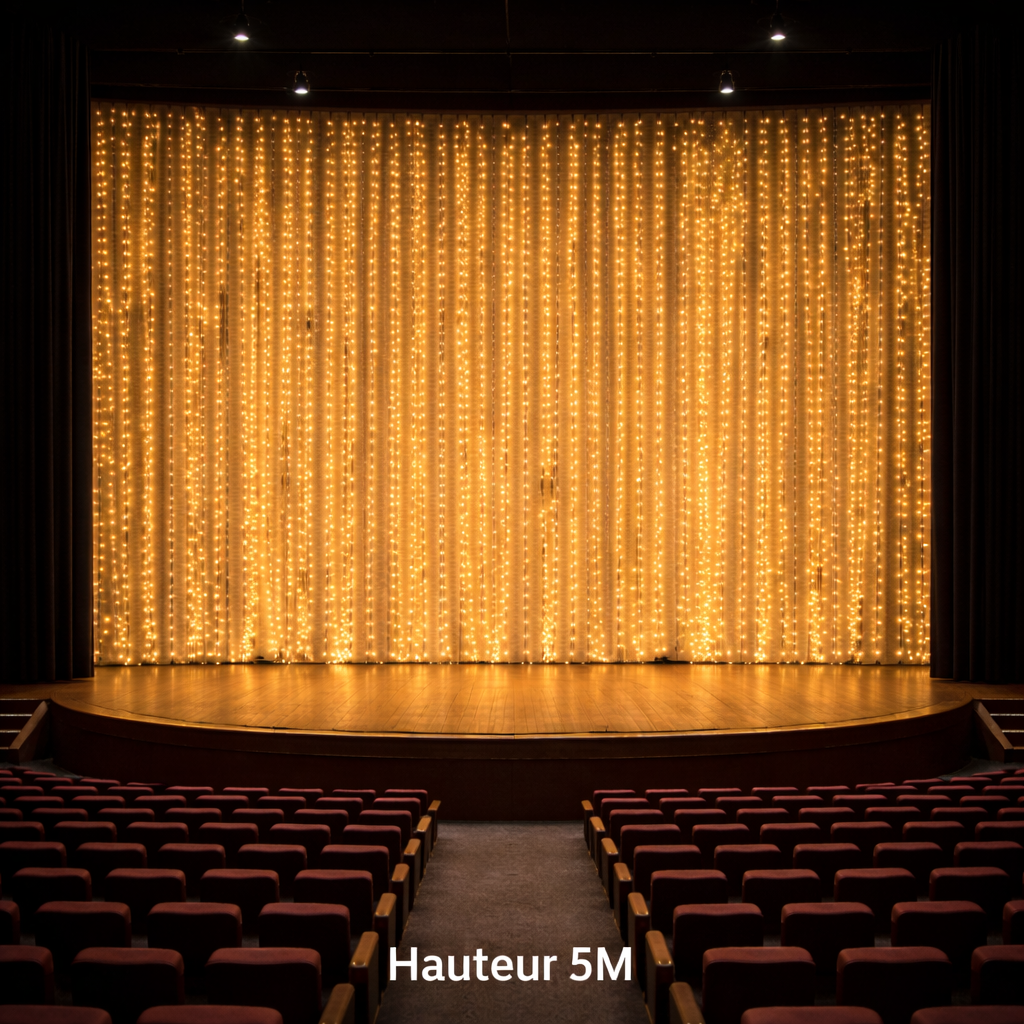 Il s’agit de rideaux composés de guirlandes LED fines, avec un espacement standard de 10 cm entre chaque LED. Ce maillage serré permet d’obtenir un fond lumineux homogène, idéal derrière un groupe de musique, des danseurs ou une scène de discours. La lumière blanc chaud diffuse une atmosphère chaleureuse et qualitative, parfaite pour mettre en valeur les artistes sans les éblouir.