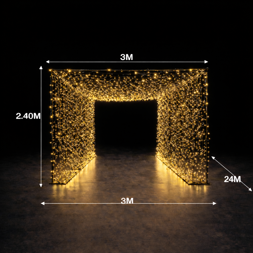 Chaque guirlande mesure 10 mètres et présente l’avantage majeur d’être raccordable. Cela permet d’adapter la structure à quasiment toutes les configurations de lieux. Les dimensions fixes assurent une stabilité optimale : 2,40 m de hauteur et 3 m de largeur, une largeur idéale pour installer un banquet en dessous. Les invités peuvent circuler aisément autour des tables tout en profitant pleinement de l’ambiance lumineuse, sans sensation d’encombrement.