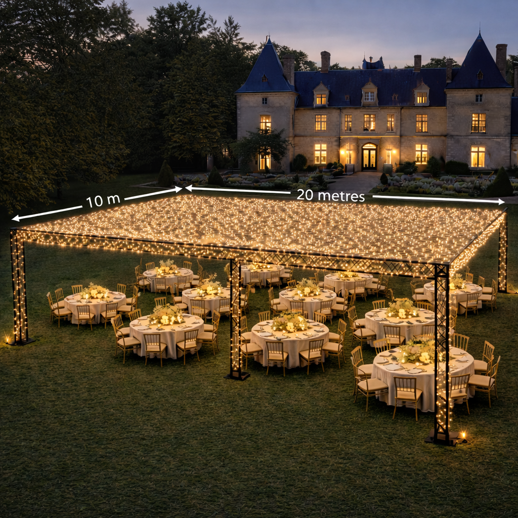 L’installation comprend 1500 mètres de guirlandes lumineuses, soit 15 000 LED, soigneusement réparties pour garantir un rendu équilibré et haut de gamme. L’espacement de 10 cm entre chaque guirlande ainsi que 10 cm entre chaque LED permet d’obtenir une trame lumineuse régulière, sans zones d’ombre ni surcharge visuelle. Le résultat est à la fois intense et délicat, idéal pour créer une atmosphère chaleureuse, féerique ou élégante selon le type d’événement.