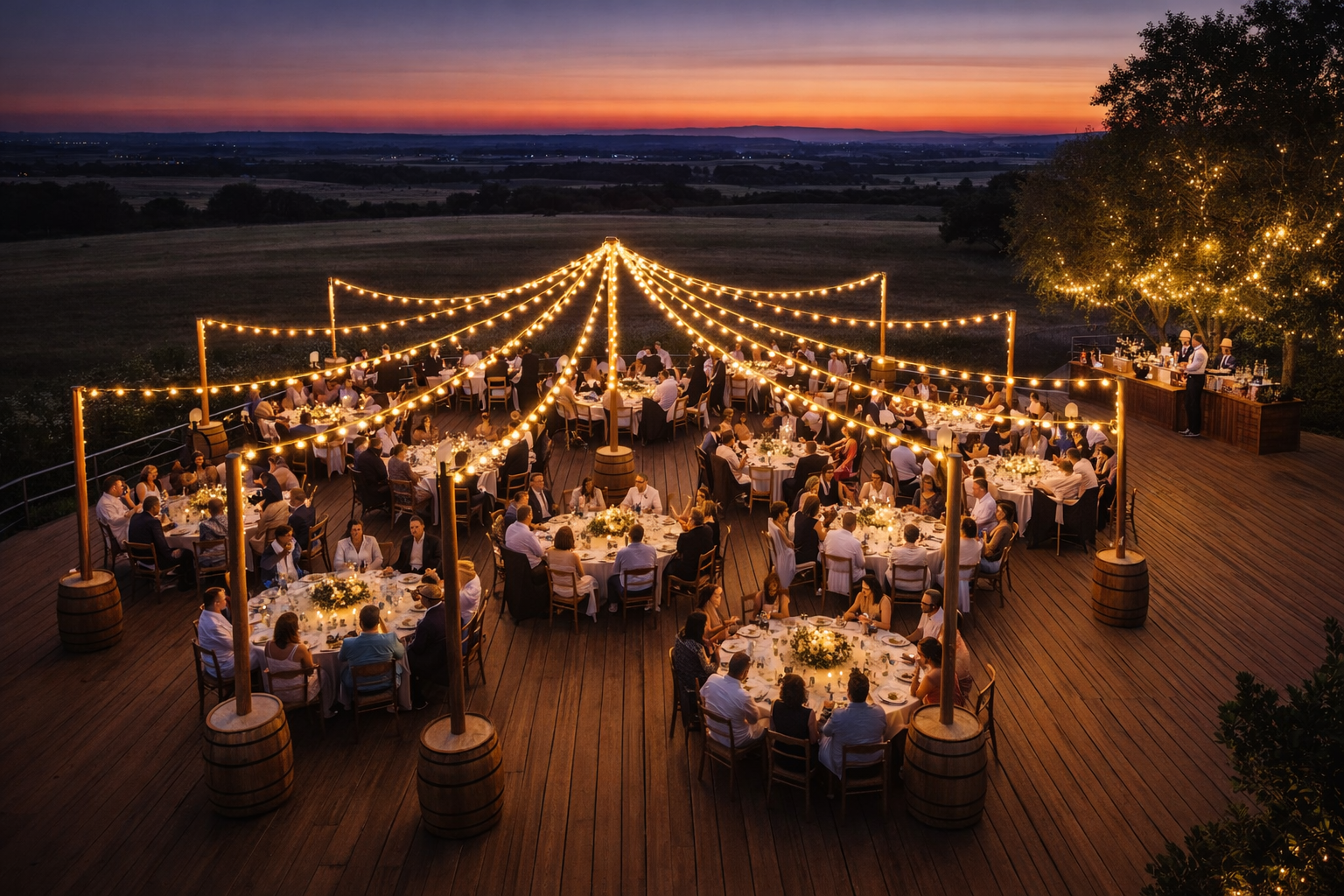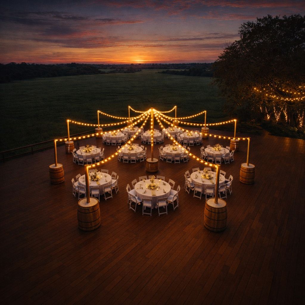 Pour sublimer vos réceptions en plein air, découvrez notre kit de mise en lumière circulaire composé de 9 tonneaux lestés de 150 kg chacun : 1 tonneau central et 8 tonneaux en périphérie. Cette configuration permet de créer un cercle lumineux spectaculaire de 18 mètres de diamètre, idéal pour structurer un espace et offrir une ambiance chaleureuse à vos invités.