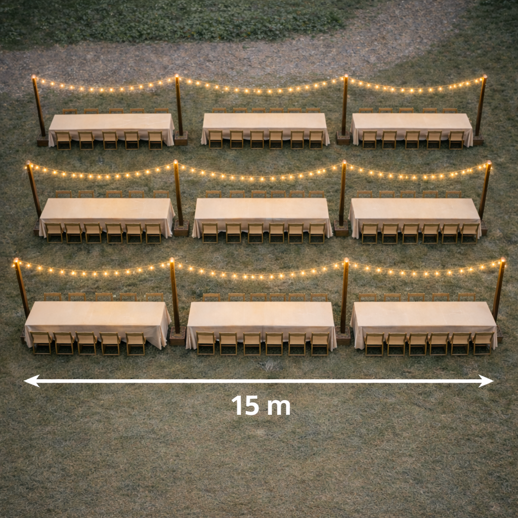 Pensé pour 3 lignées de tables de 15 mètres, soit environ 70 convives, ce kit est conçu pour que les guirlandes survolent exclusivement les tables. Contrairement à une installation décorative qui éclaire toute une zone, ici la lumière est concentrée uniquement au-dessus des convives. Le résultat : une ambiance chic, feutrée et tamisée, tout en restant parfaitement adaptée pour manger dans de bonnes conditions.
