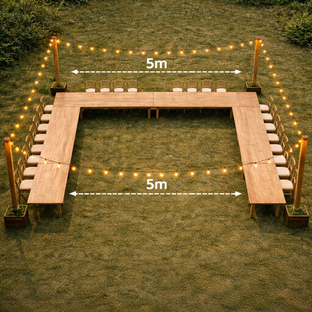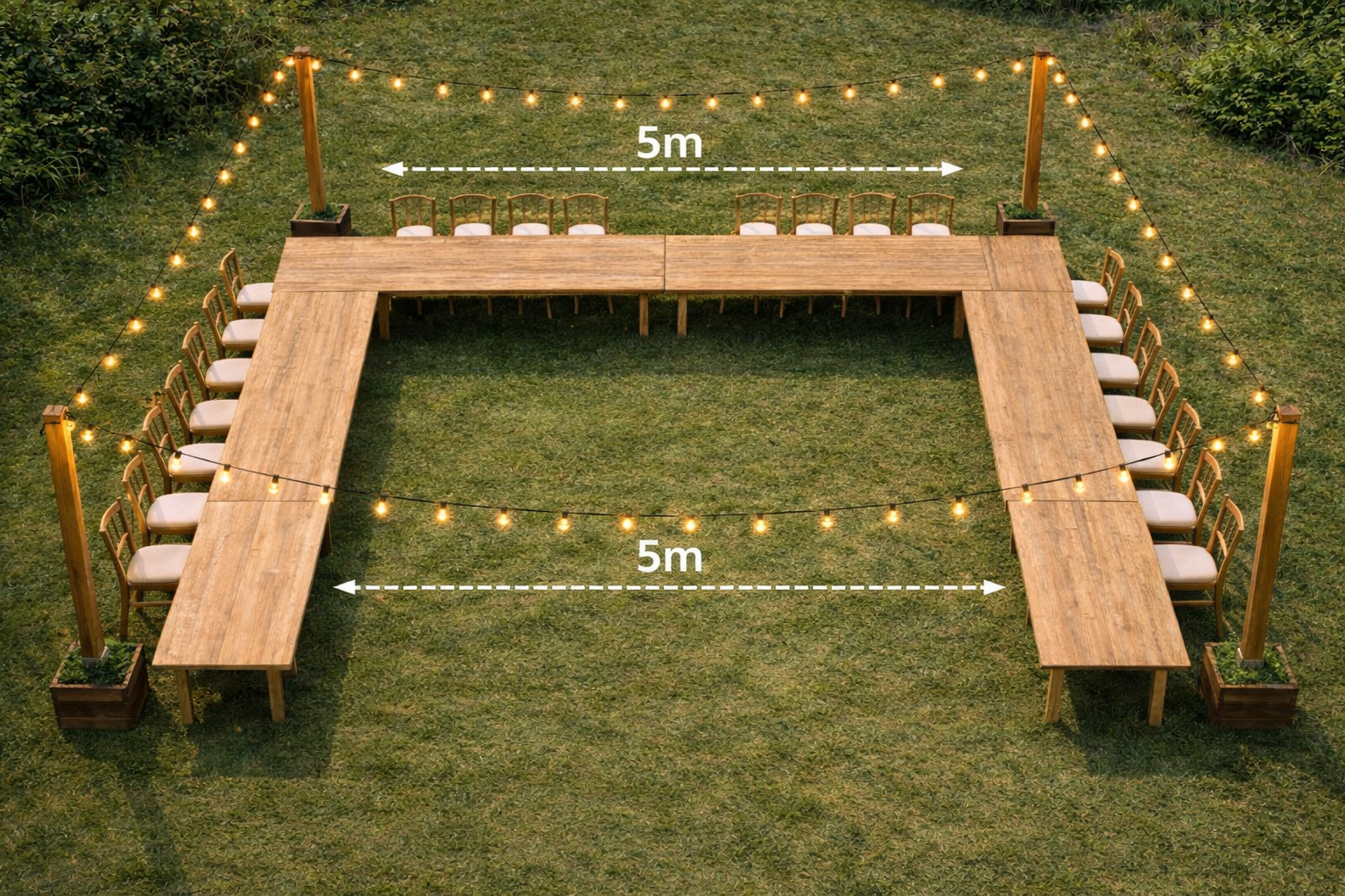 Ce kit se compose de 4 poteaux en bois massif de 90 kg chacun et de 30 mètres de guirlande LED blanc chaud. Pensé pour une installation élégante et sécurisée, il permet de mettre en valeur une table en forme de U de 5 x 5 mètres, configuration très appréciée pour les repas d’été en extérieur.