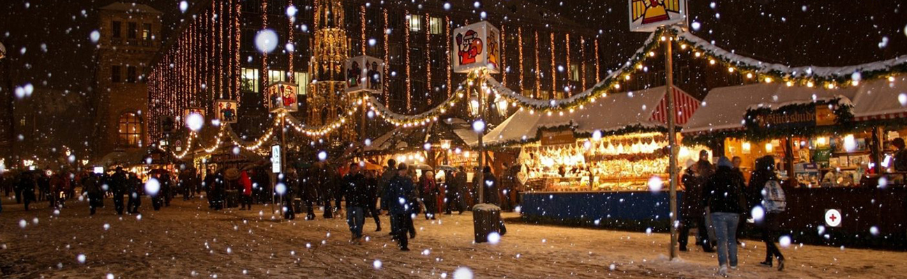 Illumination sur un Marché de Noël en France - Guirlandes blanc chaud