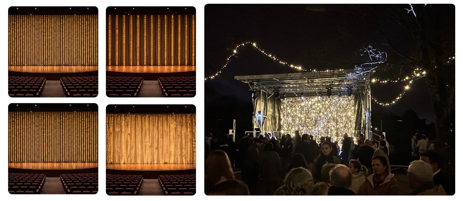 Il s’agit de rideaux composés de guirlandes LED fines, avec un espacement standard de 10 cm entre chaque LED. Ce maillage serré permet d’obtenir un fond lumineux homogène, idéal derrière un groupe de musique, des danseurs ou une scène de discours. La lumière blanc chaud diffuse une atmosphère chaleureuse et qualitative, parfaite pour mettre en valeur les artistes sans les éblouir.