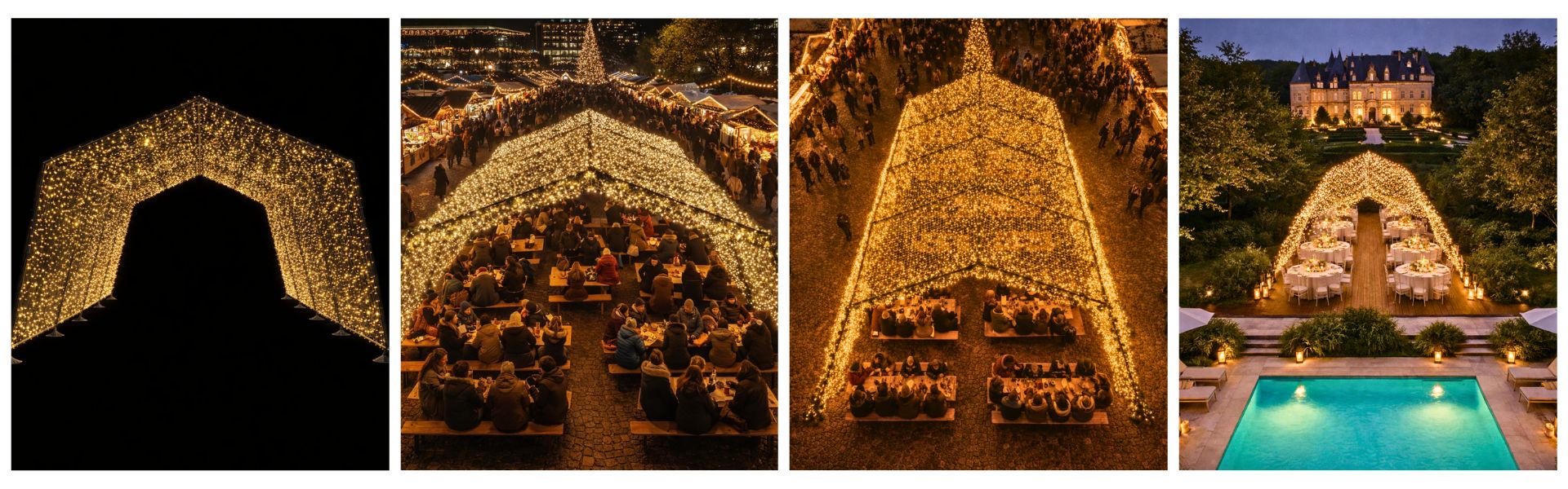 Vous pouvez ainsi concevoir une installation intimiste de quelques mètres ou déployer un tunnel lumineux spectaculaire pouvant atteindre jusqu’à 120 mètres de long.